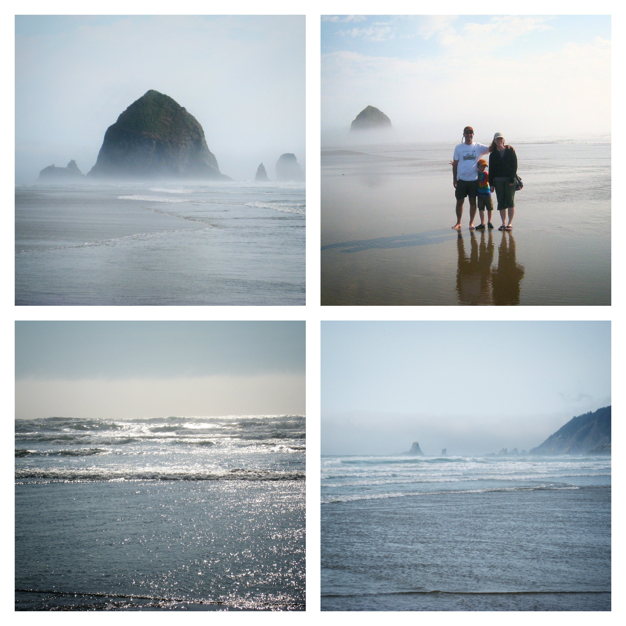 Today’s Weekly Photo Challenge asks us how we feel by the Sea.  If you are a regular visitor you already know I spend as much time as possible by the water so for me the difficult part of this challenge was to select just a few photos.  To narrow down my choices I decided to show you a fun, misty afternoon at Canon Beach on the Oregon Coast.  This visit was in the late afternoon and the beach was surprisingly quiet.  We had a great time splashing around in the shallow water pretending to surf the little waves and Ryan managed to slip a goofy expression or gesture into every picture we took as a family.