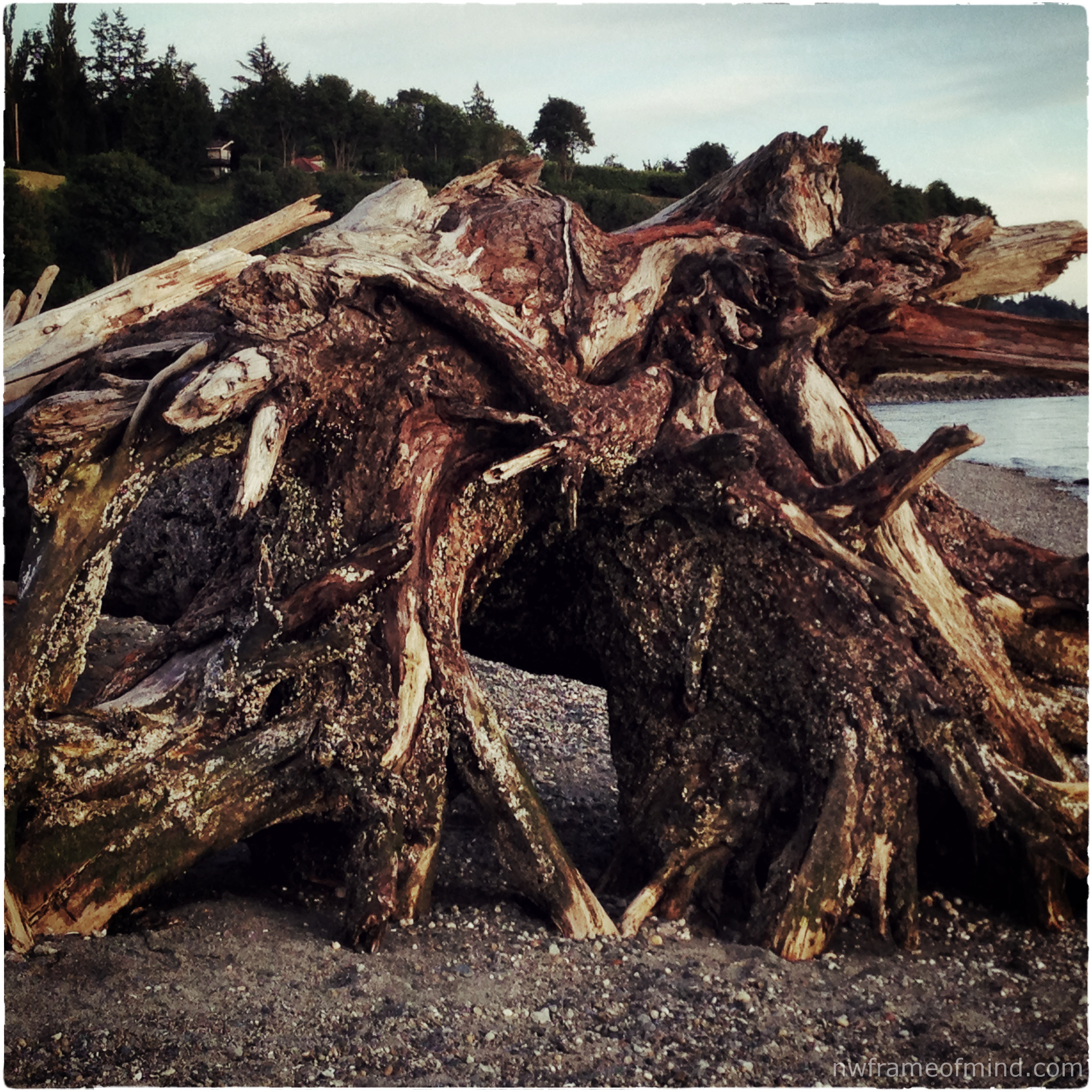 The natural arches in this large driftwood stump are a great place to play, climb and build forts on the Edmonds Waterfront.