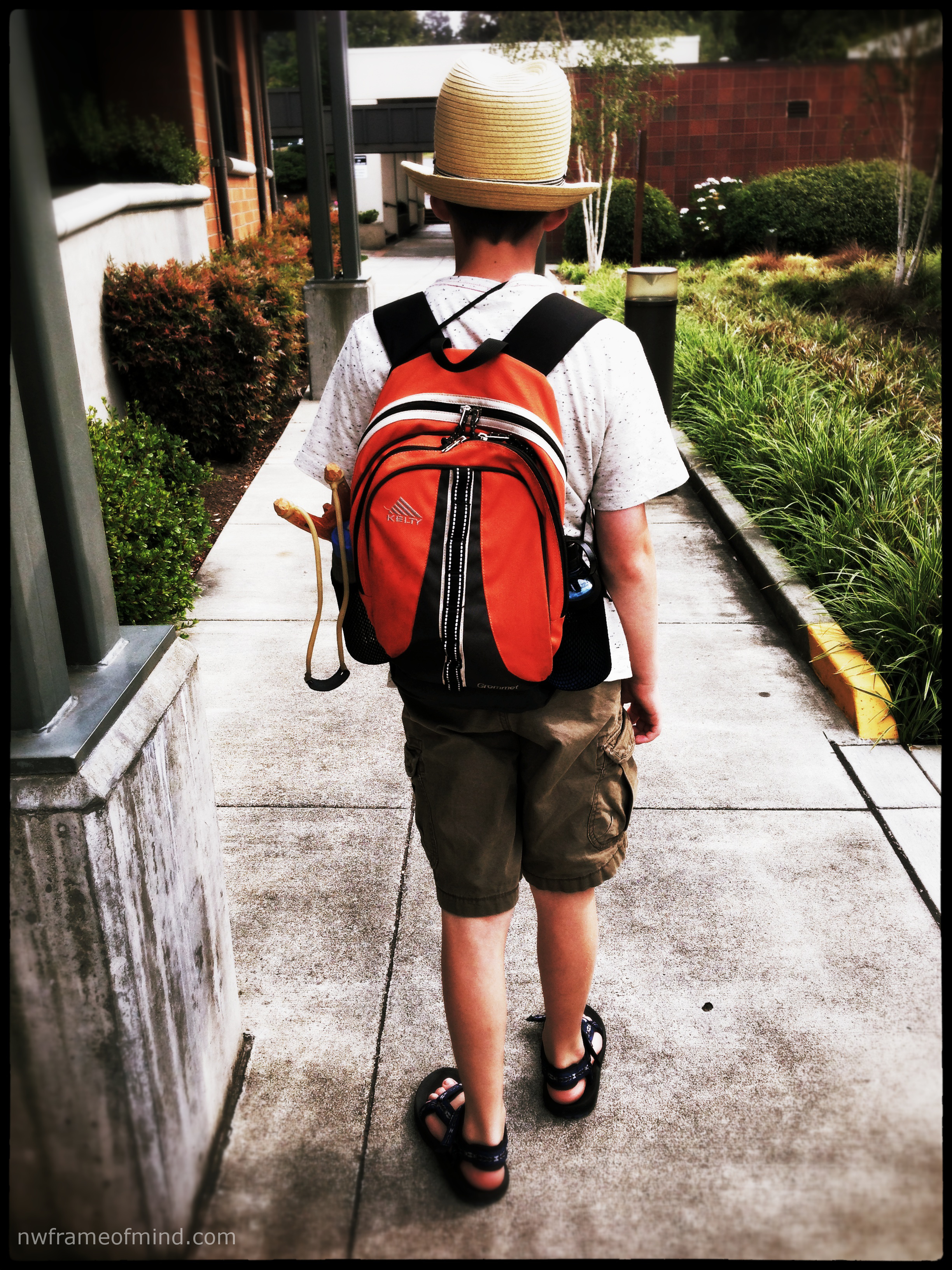 One of our favorite things to do in the summer is fill a backpack with supplies and take a walk into town to get ice cream or watch a movie.  The hike is a little over two miles each way and Ryan and I always find a few new things to look at, great photo opportunities and time for conversation away from the distractions of home.  He insists he doesn’t feel right walking without a properly filled backpack so we usually have snacks, water, a few cameras, his sling shot, bouncy balls and couple of hot wheels along for the ride.  Ryan is prepared for anything that comes our way and I am right behind him.
