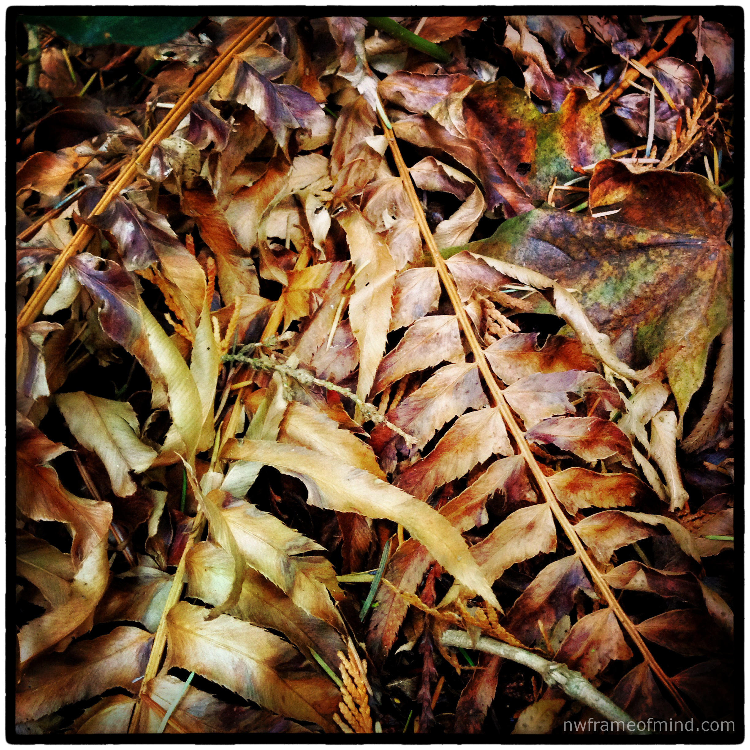 Capturing clean macro photos is always a challenge for me but I love Sally’s weekly Phoneography posts so here is my latest attempt. These fern fronds were part of the path through a park we visited Saturday afternoon and I liked the woodsy shades of brown on the forest floor while we were surrounded by so many kinds of evergreen branches above.