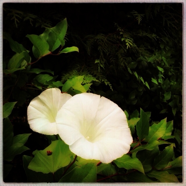 I have a love-hate relationship with this variety of white Morning Glory.  The flowers are beautiful and they bloom during my favorite time of year but the invasive nature of the vines means they overwhelm my plants in the backyard if I don’t set aside a few hours per week to cut them away from our property line and the neighbors overgrown yard.