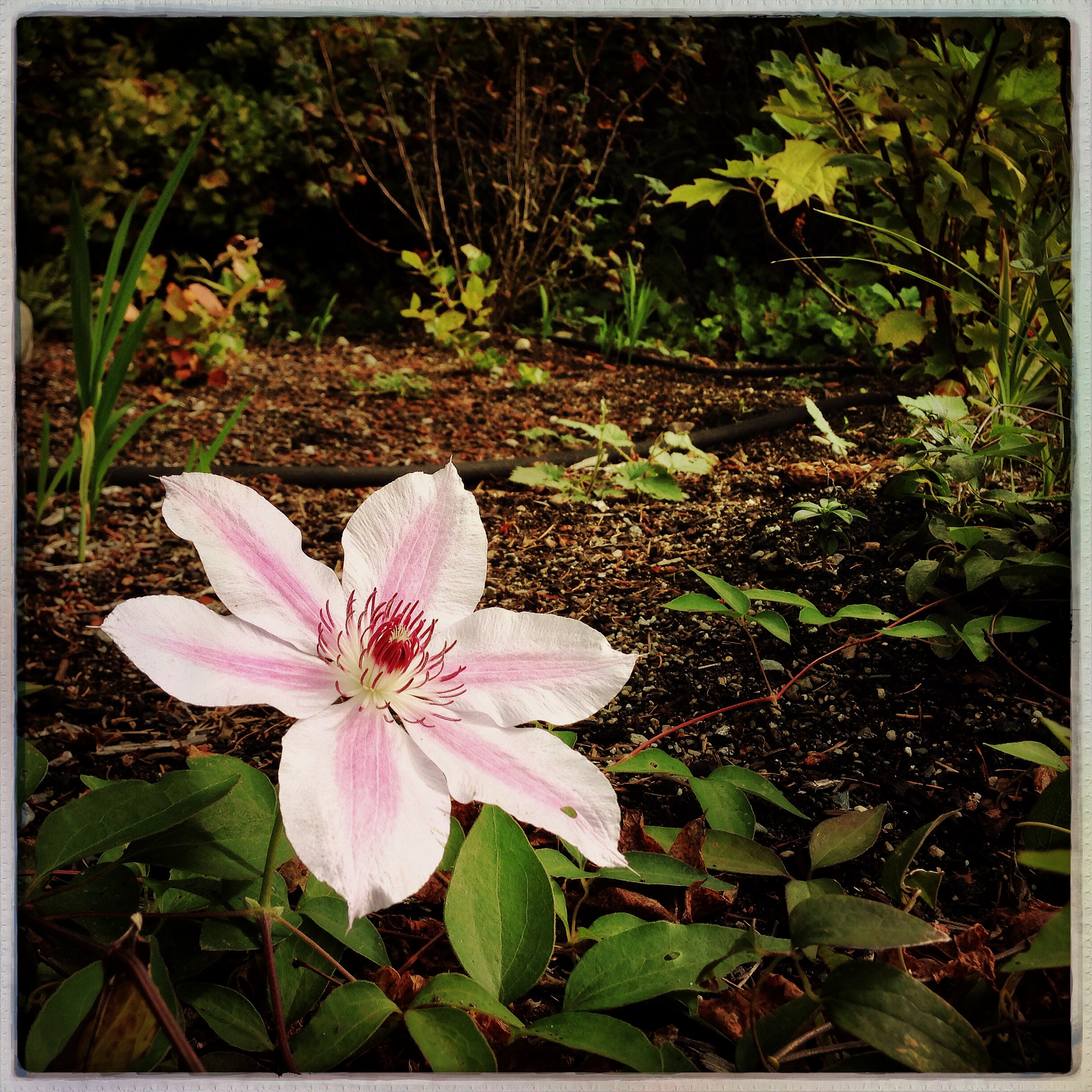 One year ago this little corner space beside our driveway was buried under pieces of old asphalt, granite boulders, tree trunks and some pretty big excavation equipment.  Bringing some life back to the bed has been an ongoing project and we’ve slowly filled in the soil with new plants that can survive this hot, dry space next to the road  but I was sure the old spring blooming clematis was gone forever.  It looks like Mother Nature had other plans though and over the past few months small shoots have reappeared in the shade of a big telephone pole.  Thursday morning one big bloom opened and I don’t care if it is a little confused about the seasons, it made me smile.